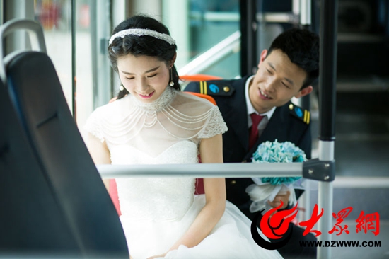 大眾網(wǎng)濟南5月21日訊 “521”是個特殊的日子,意味著“我愛你”。今天上午,公交165路停車場站內(nèi)一片歡聲笑語,駕駛員趙磊正在拍攝婚紗照。
