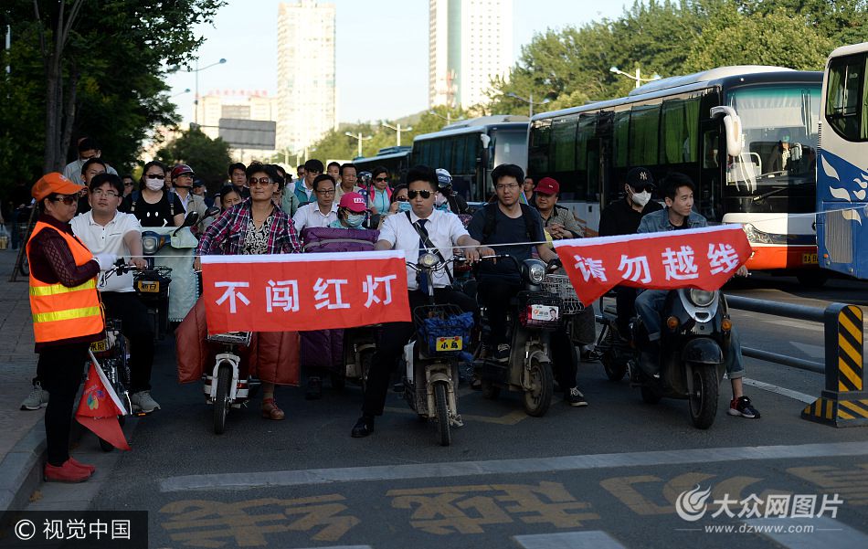2017年5月25日,濟南,經十路多個路口的非機動車道,有數(shù)十名大媽組成的交通志愿者身穿橘黃色馬甲,手持小紅旗站在路口處,當非機動車道顯示紅燈時,大媽飛快的拉起帶有“不闖紅燈”標志的繩子,擋在道路中央,阻攔住意圖闖紅燈的騎車市民。