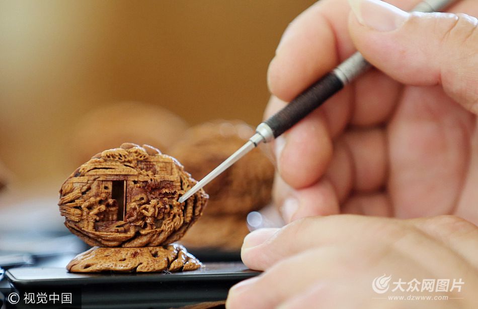 2017年5月30日,山東濰坊青年核雕師田洪波正在創(chuàng)作《憶童年》核雕作品。日前,山東濰坊青年核雕師田洪波歷時(shí)三年多時(shí)間創(chuàng)作的《憶童年》核雕作品亮相,此核雕作品共十二件,采用立體圓雕、浮雕、鏤空相結(jié)合,丟沙包、斗蟋蟀、玩彈球、捉迷藏等70、80年代兒時(shí)的游戲栩栩如生的在核雕作品上展示,充分體現(xiàn)了時(shí)代感,喚起了人們對(duì)兒時(shí)的記憶。