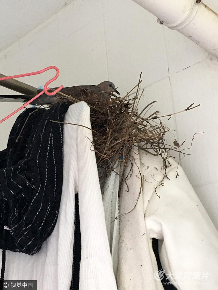 2017年5月29日,成都,胡元泓與室友們不時(shí)要用晾衣桿來(lái)穩(wěn)固鳥(niǎo)巢。成都航空職業(yè)技術(shù)學(xué)院,大二女生胡元泓和室友們?cè)谝粋(gè)月的實(shí)習(xí)過(guò)后發(fā)現(xiàn)一只鳥(niǎo)在她們寢室曬的衣服上面筑巢并產(chǎn)子。