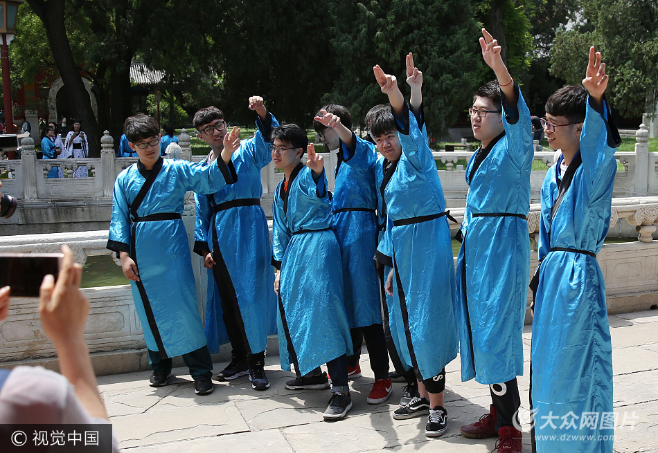 2017年6月2日,北京,高考前夕,北京的一所中學(xué)數(shù)十名高三學(xué)生身穿漢服和老師、家長,一起在北京孔廟和國子監(jiān)博物館舉行成人禮,共慶成年,步入人生新起點。