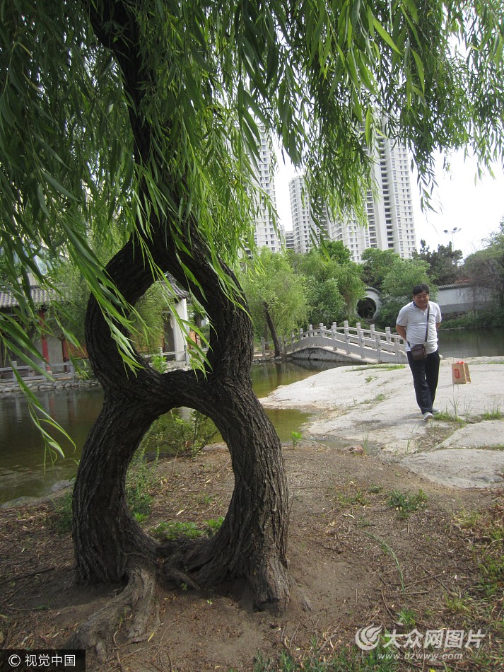 2017年06月03日,山東省日照市,山海天旅游度假區(qū)魏園內(nèi),一棵柳樹(shù)樹(shù)干像一個(gè)“葫蘆”,又似阿拉伯?dāng)?shù)字“8”。奇特的形狀吸人著眾多的市民前來(lái)參觀。