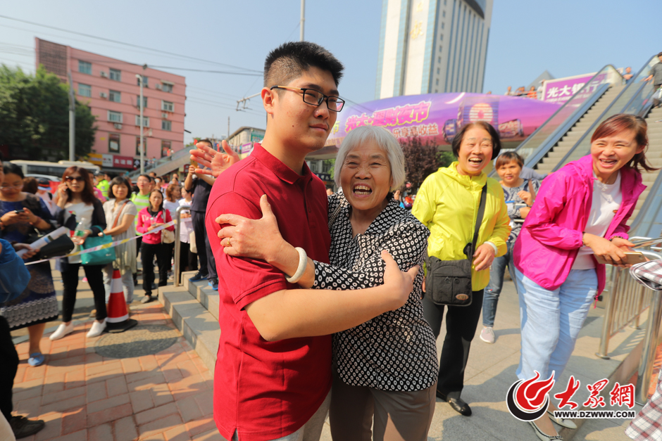 6月7日上午,山東濟南,在山東省實驗考點外,一名考生的姥姥給孩子一個大大的擁抱,并鼓勵孩子“高考加油”。大眾網(wǎng)記者 王長坤 攝