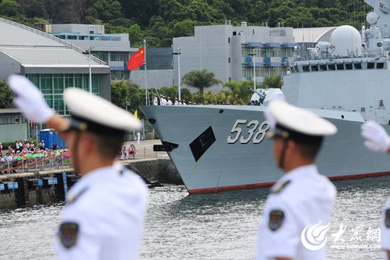 大眾網(wǎng)青島7月7日訊(通訊員 張剛 張凱)7月7日上午,正在執(zhí)行跨區(qū)機(jī)動(dòng)訓(xùn)練任務(wù)的中國(guó)人民解放軍海軍航母編隊(duì)抵達(dá)香港,參加香港回歸祖國(guó)暨中國(guó)人民解放軍進(jìn)駐香港二十周年慶;顒(dòng),受到香港特區(qū)政府和民眾熱烈歡迎。香港特區(qū)政府在昂船洲軍營(yíng)舉行隆重歡迎儀式,行政長(zhǎng)官林鄭月娥率特別行政區(qū)政府主要官員出席儀式。全國(guó)政協(xié)副主席董建華出席歡迎儀式,登上導(dǎo)彈驅(qū)逐艦銀川艦參觀,并檢閱該艦儀仗隊(duì)。