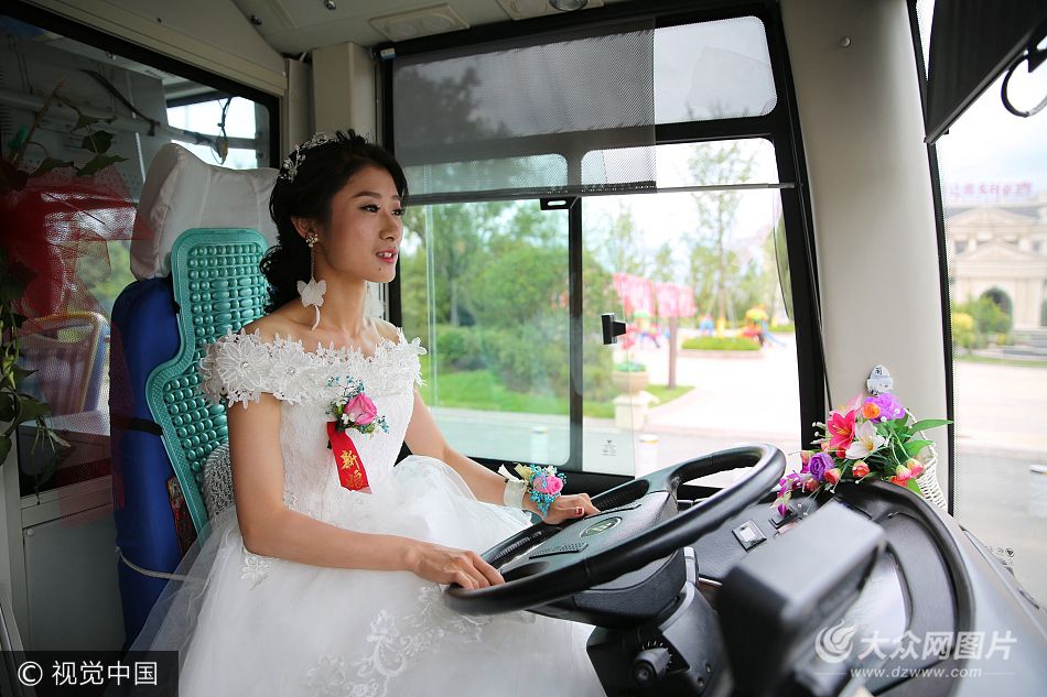 2017年7月9日,在山東青島黃島區(qū)主干道上六輛新能源公交婚車引得行人紛紛駐足側(cè)目,而頭車駕駛員竟是今天要結(jié)婚的新娘,而新郎卻做了乘客,由新娘開著公交拉著新郎去婚禮現(xiàn)場。張進(jìn)剛/視覺中國
