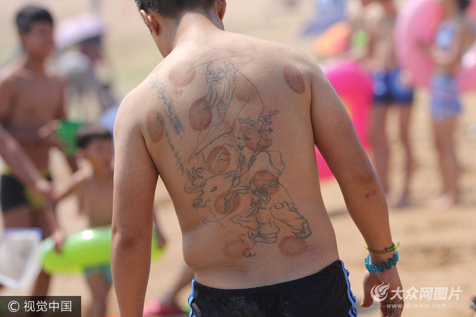 2017年7月11日,在青島第一海水浴場拍攝的洗海澡文身人。當日,數萬游人擁進青島第一海水浴場洗海澡消暑,人潮中一些光膀子游人身上琳瑯滿目的文身分外耀眼,以男士居多,圖案五花八門有的霸氣側漏有的讓人忍俊不禁。