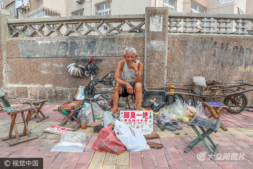 7月14日,青島。在青島市商丘路與開平路路口,一位修鞋老人特別引人注目,他頭發(fā)花白,身體硬朗,穿著背心,皮膚黝黑。老人名叫劉相德,今年77歲,老家在臨沂孟良崮。他在這里修鞋已經(jīng)20多年,一個小推車,五六個小馬扎,一個修鞋機及一些材料,這就是他的全部家當(dāng)。每天早上6點到下午1點,是他的工作時間。
