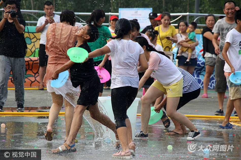 2017年7月22日,山東濱州西紙坊村舉辦了一場潑水節(jié),村民與美女們上演水槍大戰(zhàn),一起潑水狂歡,感受清涼。