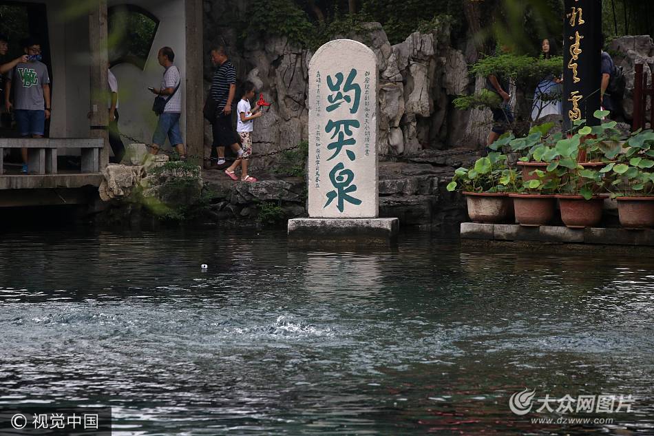 2017年8月2日,游客在山東濟南趵突泉觀賞“水涌若輪”的美景。