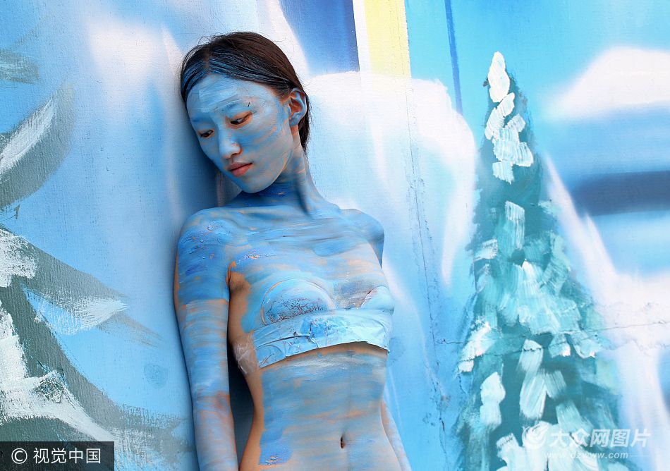 2017年8月3日,在山東煙臺某樂園,彩繪師以性感女模為“畫布”,將景區(qū)風(fēng)光與人體彩繪藝術(shù)融合,創(chuàng)造出能夠“隱身”于環(huán)境的人體彩繪,將人體彩繪玩出了新花樣。
