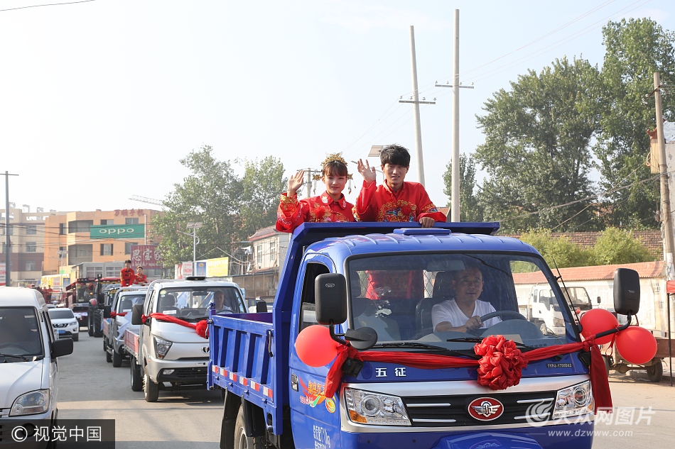 2017年8月13日,山東菏澤。“不要坐寶馬也不要自行車,我想讓你坐著農(nóng)機來接我!”8月13日,一場別開生面的農(nóng)機集體婚禮在鄆城縣侯咽集鎮(zhèn)舉行。5對新人身著中式禮服,登上由拖拉機、三輪車、紅色農(nóng)耕機等組成的婚禮車隊迎親接駕,場面十分震撼。