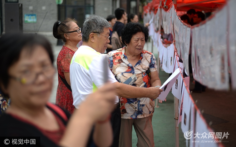 大眾網(wǎng)8月27日訊 2017年8月26日,濟(jì)南泉城路舉辦相親會(huì),現(xiàn)場(chǎng)懸掛了百余名90后單身男女青年的征婚信息,現(xiàn)場(chǎng)相親的青年可以根據(jù)公開的信息尋找伴侶。不少老人因?yàn)閮号τ诠ぷ,或者太過害羞,因此代替子女參加相親大會(huì),用手機(jī)拍攝或記錄下中意的征婚信息,并聚在一起交流征婚信息,介紹自己子女情況,希望能為子女找到合適的情侶,早日解決終身大事。