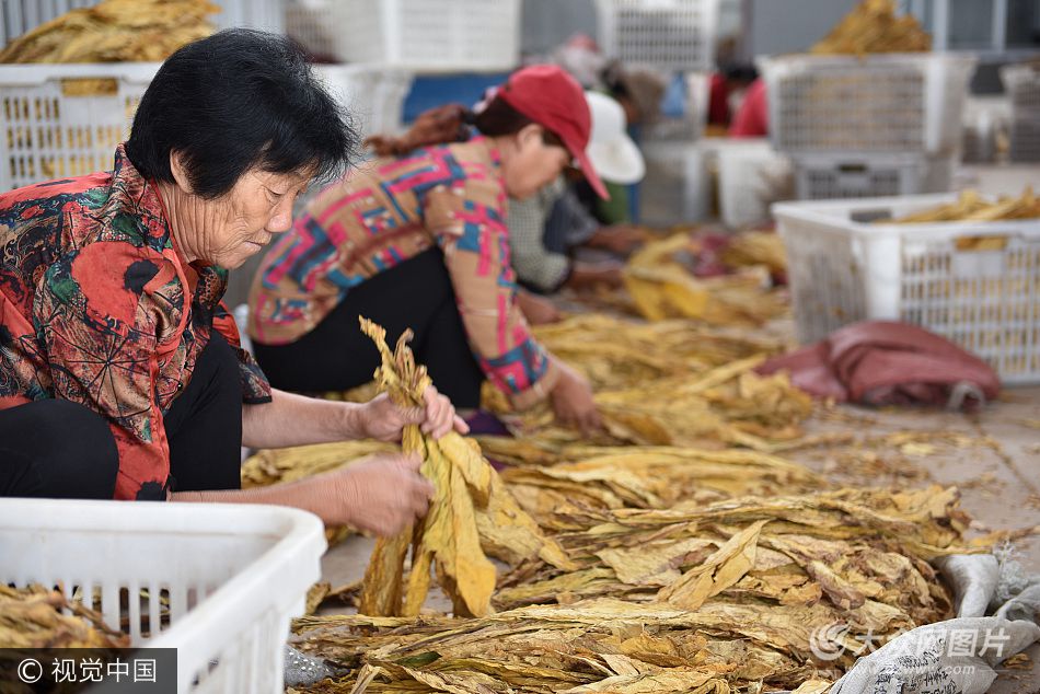 2017年8月29日,在日照市莒縣寨里河鎮(zhèn)周王河北村的一處黃煙烘烤車間,數(shù)10名農(nóng)村婦正在忙著捆綁黃煙葉子,準備上烘烤房烘烤黃煙。她們這樣辛苦的干活,一天的收入大約在50-60元左右。