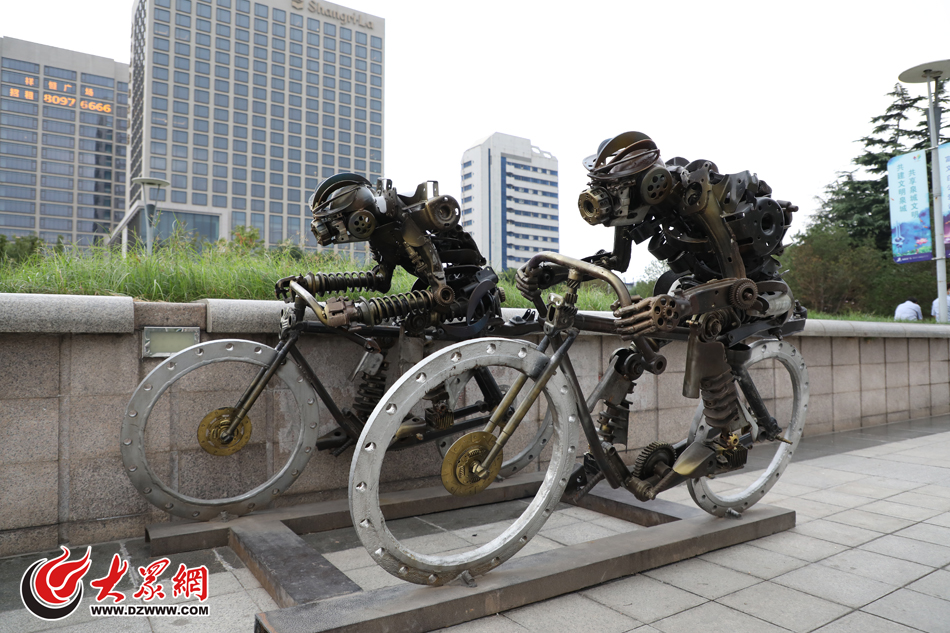 大眾網(wǎng)9月4日濟(jì)南訊 近日,濟(jì)南泉城廣場(chǎng)中多了很多鋼鐵做成的雕塑,據(jù)了解,這些雕塑都是用廢舊的汽車(chē)零件和其他零件拼接而成,因?yàn)樵煨透鳟,有不少市民圍觀。(亓翔 攝)