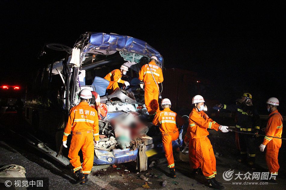 2017年9月6日晚間,G75線蘭海高速?gòu)V西北海往南寧方向K2047+400m處,一輛大客車追尾一輛貨車,客車嚴(yán)重變形。目前,事故已造成3人死亡,24人受傷。 鐘欣(廣西分社)/中新社/視覺(jué)中國(guó)