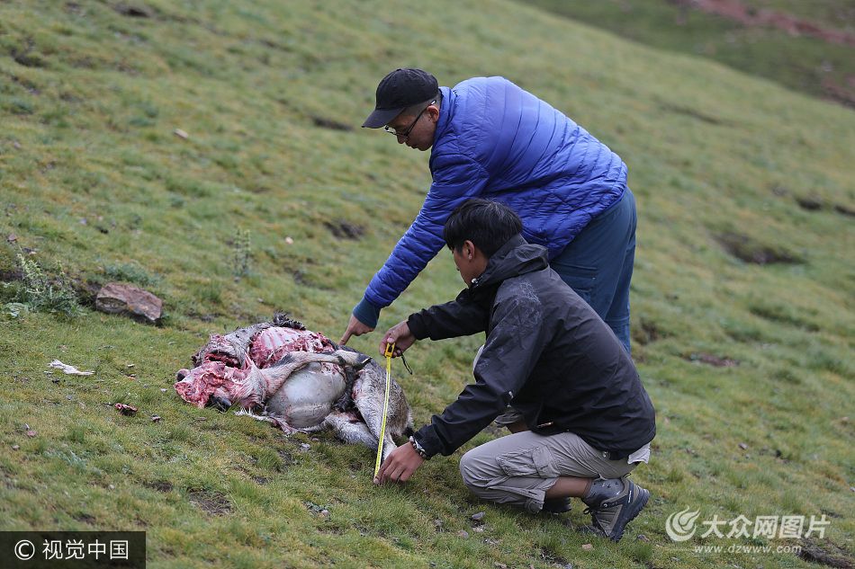 隨著藏獒市場(chǎng)的崩塌、蟲草經(jīng)濟(jì)的興起及牧民生活方式的改變,近些年,在三江源地區(qū)出現(xiàn)了大量的流浪藏狗。曾有人拍到流浪藏狗圍堵雪豹并與之搶食,亦有線索表明,流浪藏狗可能會(huì)對(duì)當(dāng)?shù)匦堋⒗、鹿等野生物種形成某種競(jìng)爭(zhēng)。由此也引來連串的疑問。數(shù)量龐大的流浪藏狗,是否會(huì)對(duì)當(dāng)?shù)厣鷳B(tài)形成沖擊?以瀕危物種雪豹為首的野生動(dòng)物,其生存是否會(huì)受到流浪藏狗的威脅?圖為8月27日一早,研究者返回巖羊尸體所在位置,發(fā)現(xiàn)巖羊又被吃去了大半。劉銘玉和求尼正在測(cè)量剩下的半只巖羊尸體的數(shù)據(jù)。
