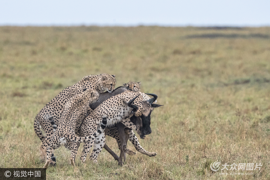 當(dāng)?shù)貢r間2017年8月24日,肯尼亞馬賽馬拉,5只年輕的獵豹合力捕殺一只牛羚。