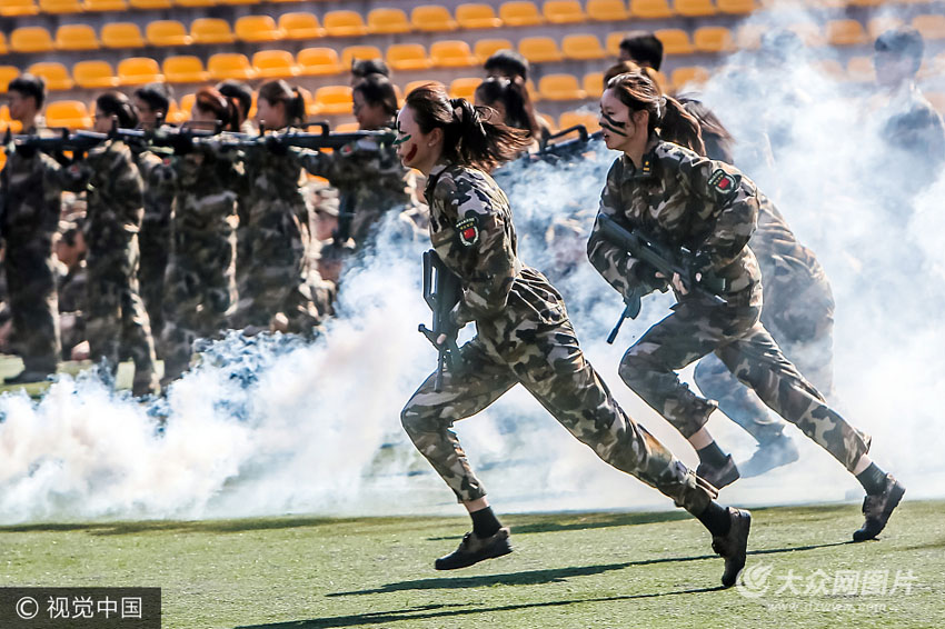 9月30日,山東大學(xué)2017級新生軍訓(xùn)匯報(bào)表演在濟(jì)南舉行。在匯演中,數(shù)千名女大學(xué)生們身穿迷彩服,她們手執(zhí)“鋼槍”或“匕首”,現(xiàn)場操練女子格斗術(shù),展示出女大學(xué)生們的颯爽英姿。