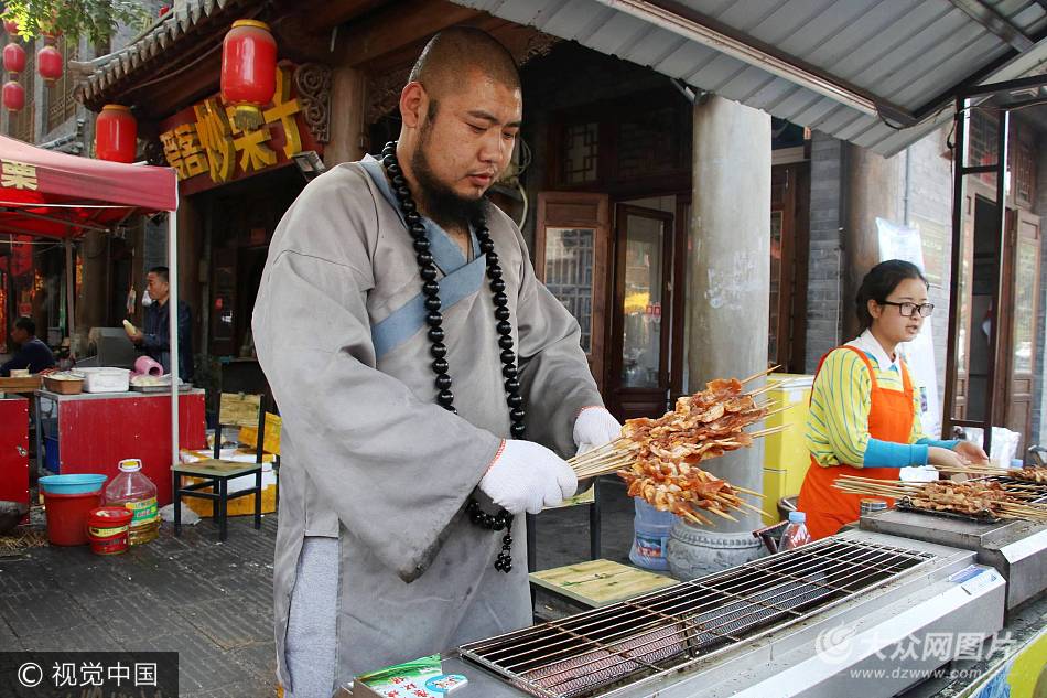 大眾網(wǎng)10月7日訊 10月5日,在山東青州一景區(qū),“花和尚”魯智深改行做起了烤肉串生意。在攤位上忙著烤肉串的小伙子大塊頭,剃著光頭,濃眉大眼,一臉絡(luò)腮胡子,身材魁梧,穿著古裝,胸前掛一串粗大的黑色佛珠,旁邊還立著一根水磨禪杖,還真有幾分魯智深的模樣。國慶中秋小長假期間,這里每日接待游客數(shù)萬人,“魯智深”的生意也是相當(dāng)火爆。