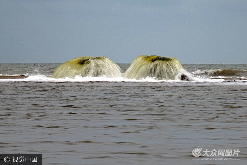 2016年10月8日,山東青島小雨過后,靈山灣海濱市政雨水排放口現(xiàn)“蘑菇泉”。
