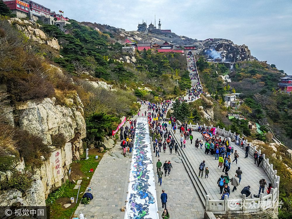 2017年10月14日,在泰山之巔天街上,袁海龍等齊魯名家運用潑墨、點染、勾勒等技巧,現(xiàn)場一同繪制了長達(dá)56米的巨幅山水長卷《大美泰山》,令游人大飽眼福。