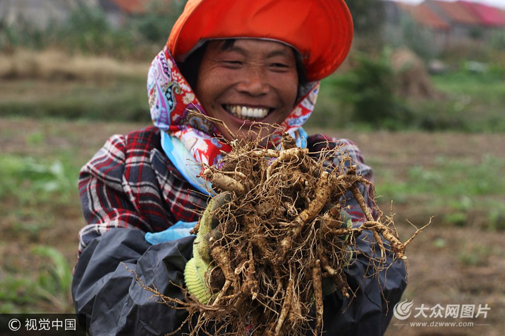 2017年10月12日,山東文登多名農(nóng)村婦女在農(nóng)田里撿拾剛剛收獲的西洋參。金秋時節(jié),山東文登萬畝西洋參迎來豐收,機器扒出的參需要進行人工撿拾,當?shù)卦S多婦女加入到撿參大軍,從早到晚日撿西洋參千余斤,可以獲得80元報酬。