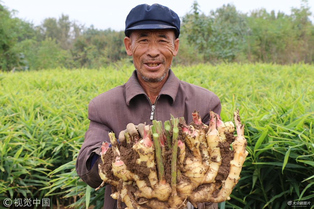 2017年10月18日,山東濰坊安丘市輝渠鎮(zhèn)李家河村的農(nóng)戶正在收獲大姜。11.6斤的一塊姜在村里的姜王評比中,拔得頭籌。山東安丘是中國知名的“‘蒜姜之鄉(xiāng)’”,這里的農(nóng)戶靠種植大姜過上了好日子。