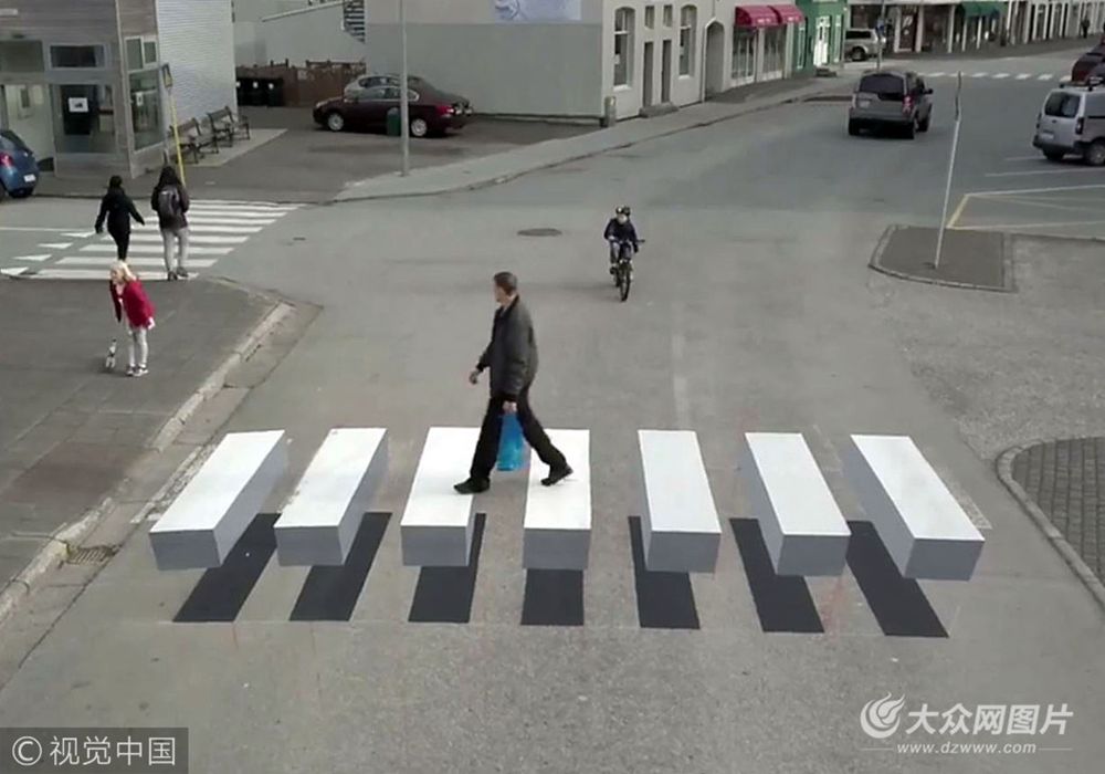 當?shù)貢r間2017年9月26日,冰島伊薩菲厄澤,在冰島的一個小鎮(zhèn)上,出現(xiàn)了這種令人難以接受的十字路口。這種給人以漂浮感覺的“3D斑馬線”是為了提醒過往司機注意減速,如果測試結(jié)果該方法確實對于減緩車速有效,將有跟多的3D斑馬線運用在城鎮(zhèn)的到路口。