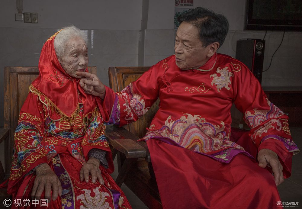 2017年10月22日上午9時(shí)許,96歲的魏阿婆穿上龍鳳褂準(zhǔn)備拍照,旁邊穿上新郎服的是他75歲的兒子蔡炳杰。他們將拍攝一組結(jié)婚照,那是母親一輩子的心愿,也是蔡炳杰一輩子的心愿。