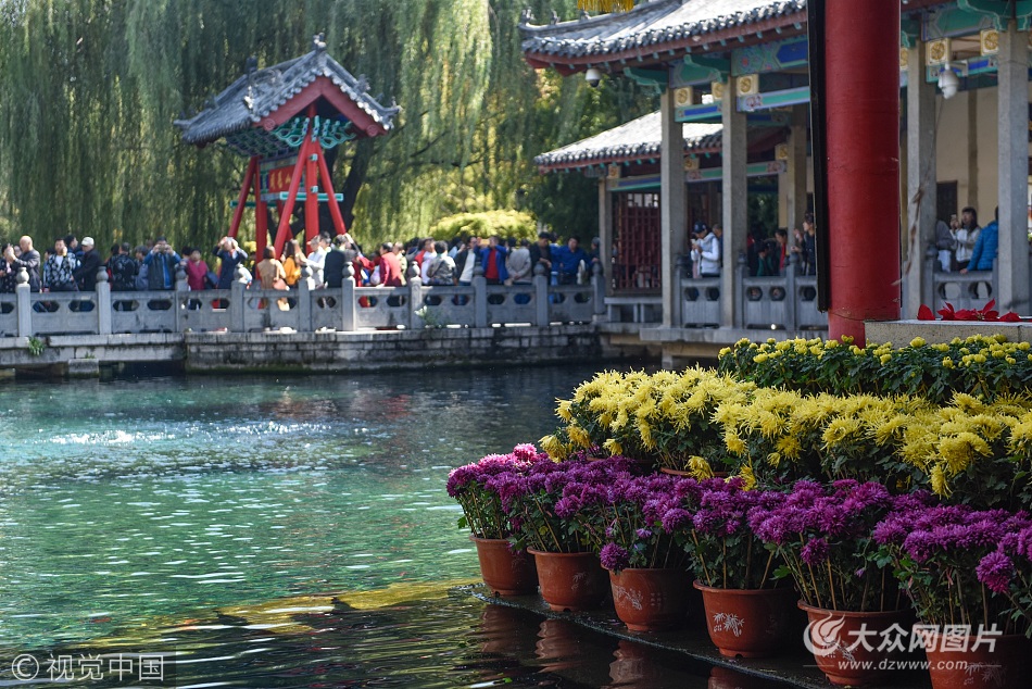 2017年10月24日,泉城濟(jì)南趵突泉公園內(nèi),各種菊花千姿百態(tài)、爭(zhēng)相斗艷,濃厚的深秋氛圍,吸引了大批游客在濟(jì)南傳統(tǒng)的菊花節(jié)前夕提前賞菊游園。25日,第38屆趵突泉金秋菊展如期舉行,園內(nèi)菊花將多達(dá)10萬(wàn)余盆。同往年一樣,今年的菊展也將持續(xù)一個(gè)月。