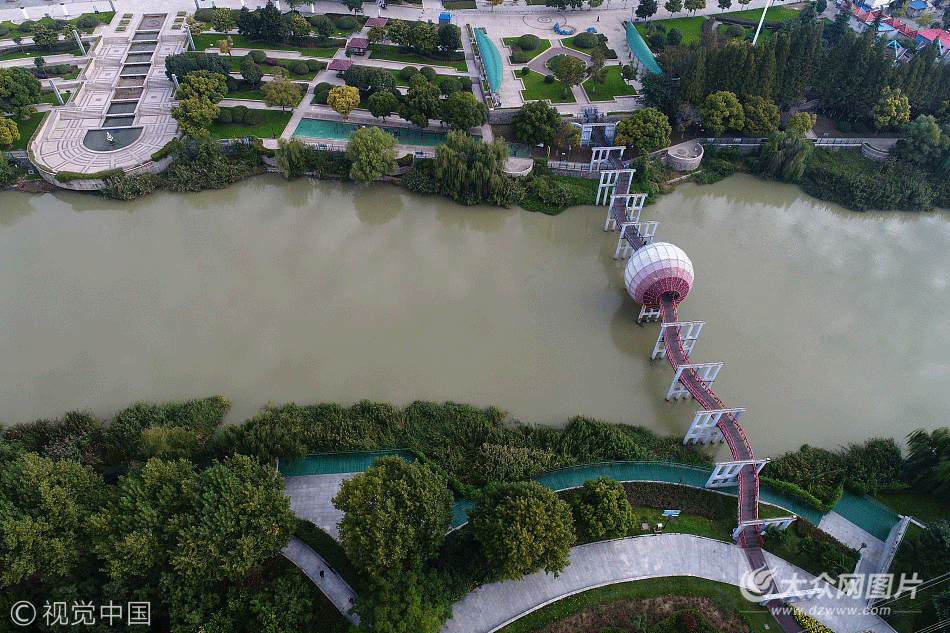 2017年10月25日,江蘇省淮安市,航拍古淮河上的中國南北地理分界線標(biāo)志園景觀。秦嶺淮河一線是中國的南北地理分界線,淮安在古淮河上建立的中國南北地理分界線標(biāo)志園用紅藍(lán)代表南北,色彩鮮明,成為古淮河上一道風(fēng)景線。