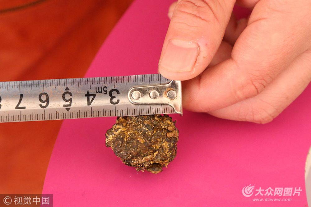孫建國在莒縣陵陽鎮(zhèn)趙家葛湖村開了一家如意全羊館,他在殺羊時意外驚喜,發(fā)現(xiàn)了這顆“怪石”!肮质北砻鏋樯詈稚,十分堅硬,散發(fā)出濃濃的膻味,測量直徑約為3厘米。