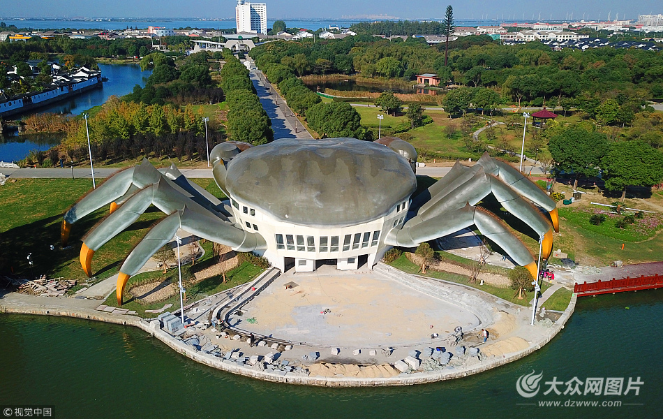 2017年10月31日,江蘇省昆山市巴城巴解園內(nèi)的東陽澄湖岸邊,一只青背白肚金爪黃毛,長75米,高約16米的蘇州陽澄湖“超級大閘蟹”栩栩如生。