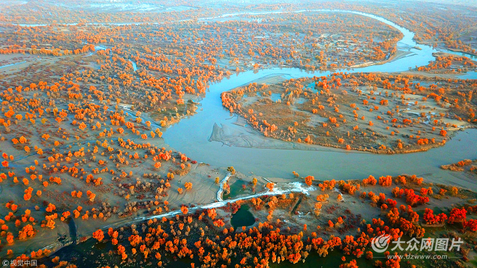 金秋季節(jié),新疆塔里木河流域出現(xiàn)五彩斑斕的景色,在新疆塔里木盆地塔克拉瑪干大沙漠--“極旱荒漠”里出現(xiàn)“極端美景”。
