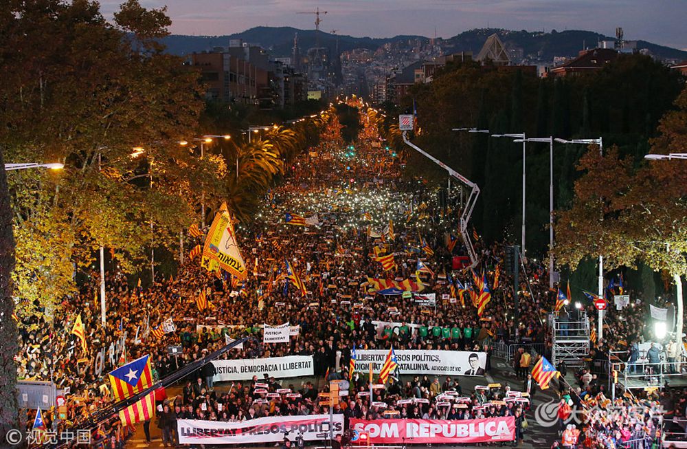 當(dāng)?shù)貢r間2017年11月11日,西班牙巴塞羅那,親獨立者舉行大規(guī)模游行,要求釋放加泰羅尼亞地區(qū)活動家和領(lǐng)導(dǎo)人。