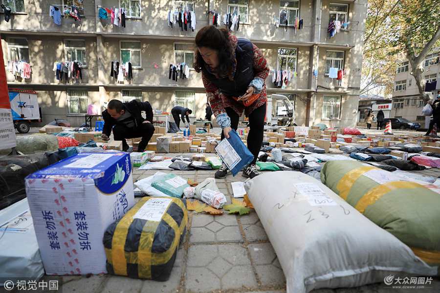 2017年11月12日,濟(jì)南,在山東師范大學(xué)千佛山校區(qū),學(xué)生宿舍樓前的空地被快遞包裹占據(jù)。