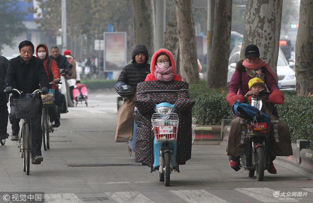 2017年11月16日,在濟(jì)南泉城路上,市民出行全副武裝抵御寒潮的侵襲。據(jù)了解,受強(qiáng)冷空氣影響,今明兩天山東將出現(xiàn)大風(fēng)和降溫天氣,多地氣溫直降10℃,最低溫降至-5℃。