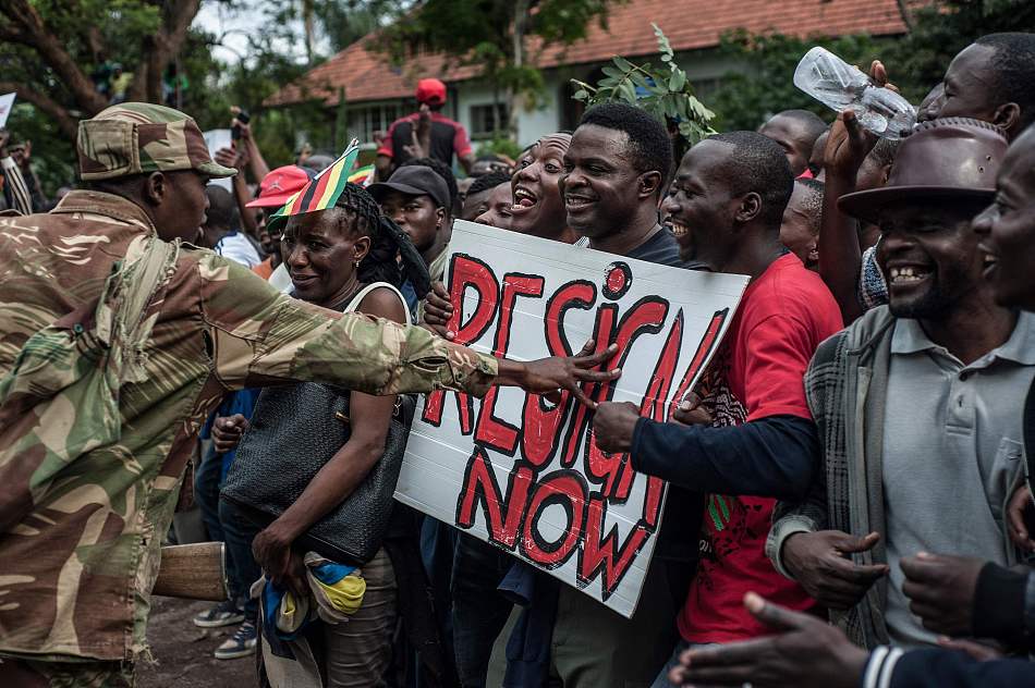 當(dāng)?shù)貢r(shí)間2017年11月18日,津巴布韋哈拉雷,民眾舉行游行反對(duì)總統(tǒng)穆加貝,要求其辭職下臺(tái)。