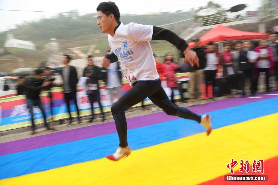 11月25日,重慶涪陵紅酒小鎮(zhèn)第四屆高跟鞋彩色跑開跑,吸引了不少男士穿著高跟鞋參賽。據(jù)悉,此次彩色跑的比賽項目分別為百米跑男女組、百米接力賽、彩色親子跑、登山跑男女組。楊孝勇 攝