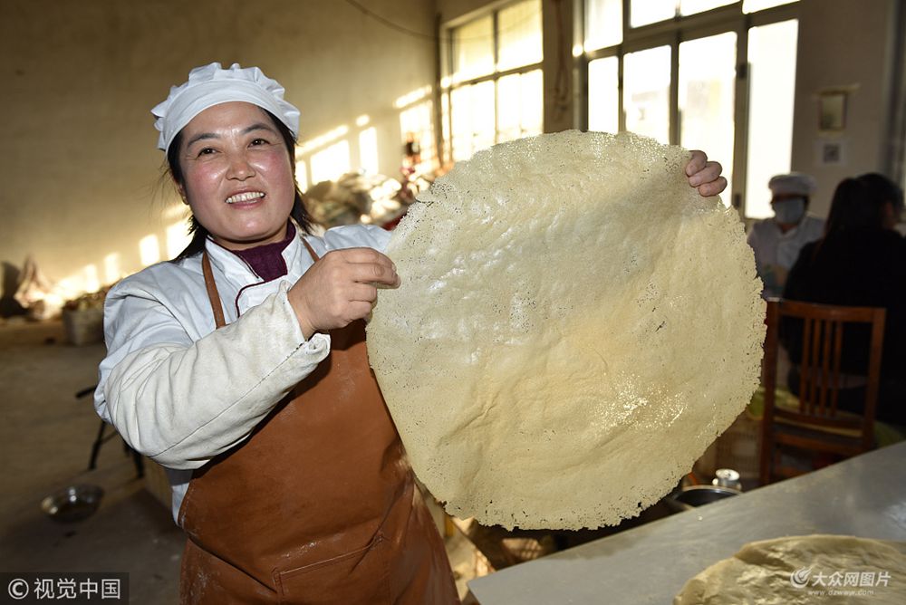 2017年11月26日,在山東省日照市五蓮縣前魏家村,今年46歲的高月逢在展示剛剛用地瓜做出的煎餅。從去年開始,她和幾個(gè)姊妹們用地瓜做煎餅,只干3個(gè)月就能賣16萬(wàn)元。