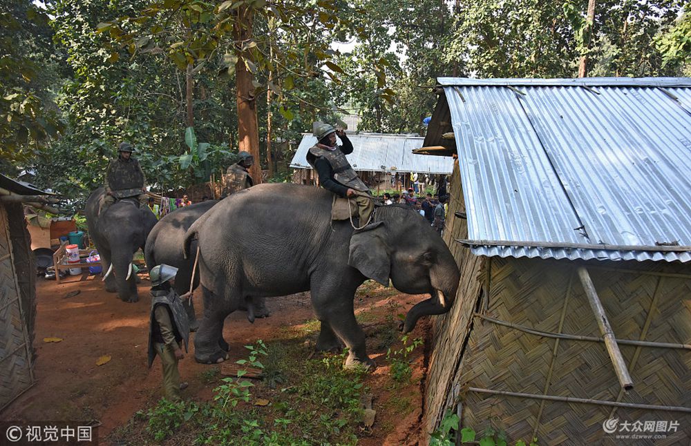 當(dāng)?shù)貢r(shí)間2017年11月27日,印度阿薩姆邦高哈蒂,在當(dāng)?shù)氐腁mchang野生動(dòng)物避難所,印度警方本周一出動(dòng)大象,對(duì)在該避難所數(shù)百人占有的非法居住區(qū)進(jìn)行拆除。