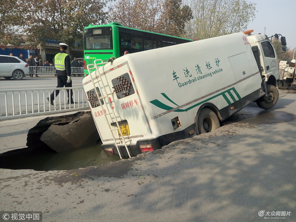 017年11月28日上午,山東菏澤市區(qū)中山路與牡丹路交叉口附近,路面突然塌陷,菏澤市公安局交警支隊一輛護欄清洗車在人行道正常行駛作業(yè)中陷入其中。