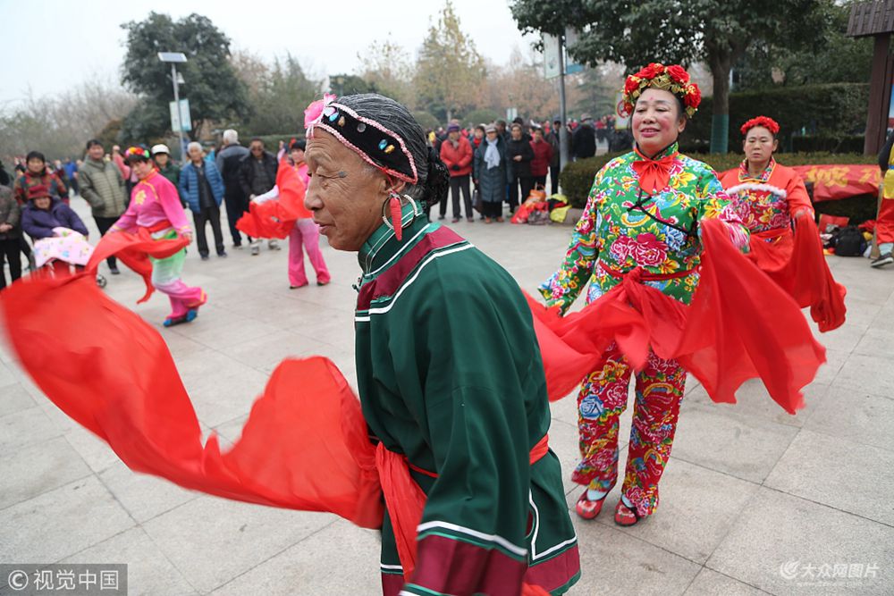 12月4日,在濟(jì)南英雄山赤霞廣場(chǎng)上,一位68歲的大爺扮演媒婆表演“斗雞舞”,吸引眾多市民圍觀觀看,滑稽的表演逗笑不少市民。