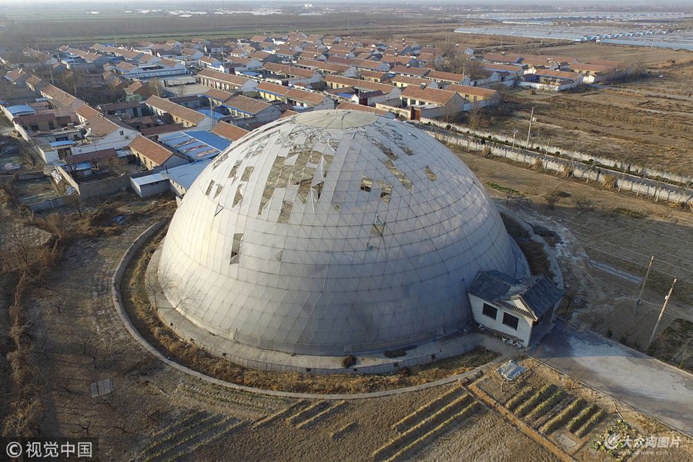 2017年11月6日,山東省東營市,一座外觀呈半球狀且面積巨大的建筑佇立在市郊主干道旁,獨特的建筑風格令過往司機無不側目多看一眼。據(jù)稱,這棟建筑多年前是一家飯店,如今已經(jīng)荒廢,留守老人將此地作為存放白菜的“地窖”。