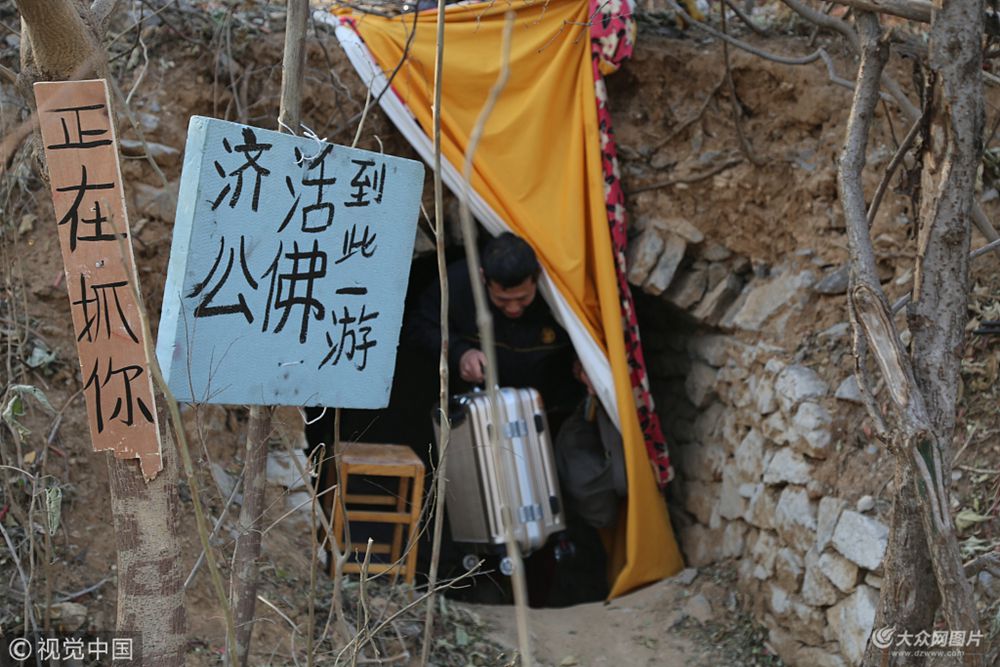 濟(jì)南市中區(qū)陽光舜城小區(qū)附近有座臥虎山,半山腰上有處洞穴。最近幾日,幾位常來山上鍛煉的市民發(fā)現(xiàn)洞穴里多了位“主人”,“有個(gè)小伙子在洞里支了床、簾子、桌子,像是住下了,大冷天的讓人不放心。”