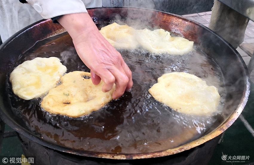 2017年12月6日,山東威海。按照小攤每天油炸品的銷量來看,一天下來,鄭章亮至少要徒手在油鍋里翻油條、油餅上千次。
