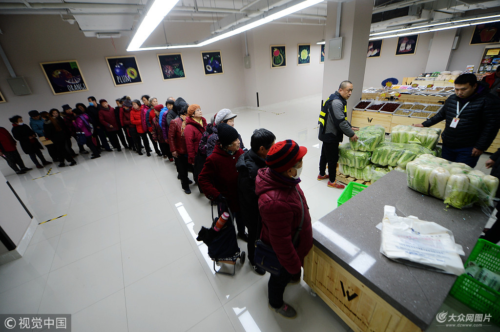 2017年12月16日,山東省濟(jì)南市,在緯十二路地下二層的人防商城,占地2000平方米的便民菜市場(chǎng)開(kāi)始營(yíng)業(yè),50多個(gè)營(yíng)業(yè)攤位銷售新鮮的蔬菜、肉制品、海鮮、面食和水果,貨架全部統(tǒng)一樣式,商販全部統(tǒng)一著裝,市民可以一站式購(gòu)買全各種果蔬副食。據(jù)了解,這是濟(jì)南首個(gè)利用地下人防商業(yè)街開(kāi)設(shè)的菜市場(chǎng),地下一層經(jīng)營(yíng)各種時(shí)尚服飾和餐飲,地上一層與BRT站臺(tái)相同,市民購(gòu)物買菜交通便利。為吸引更多市民前來(lái)購(gòu)買蔬菜,商場(chǎng)每天分四個(gè)時(shí)段免費(fèi)贈(zèng)送白菜,全天贈(zèng)送白菜1200多顆,總重達(dá)到5000多斤,吸引眾多老人前來(lái)領(lǐng)取,每人限領(lǐng)一顆,每顆白菜售價(jià)2元左右。