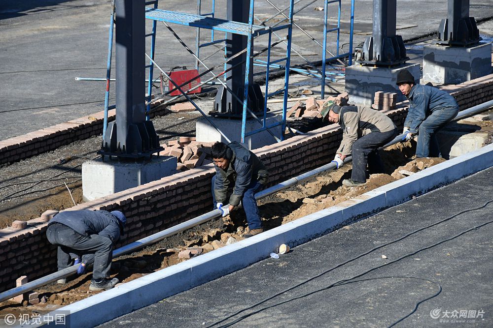 2017年12月19日,山東煙臺(tái),龍煙鐵路煙臺(tái)西站站外廣場(chǎng),四位農(nóng)民工在進(jìn)行路燈安裝工程作業(yè),迎接12月28日龍煙鐵路正式載客運(yùn)營。