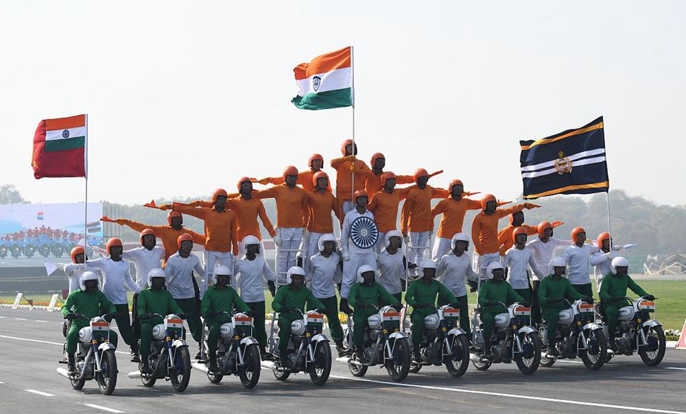 當(dāng)?shù)貢r間2018年1月15日,印度新德里,印度舉行建軍節(jié)70周年閱兵儀式,再現(xiàn)“摩托車疊羅漢”神技。