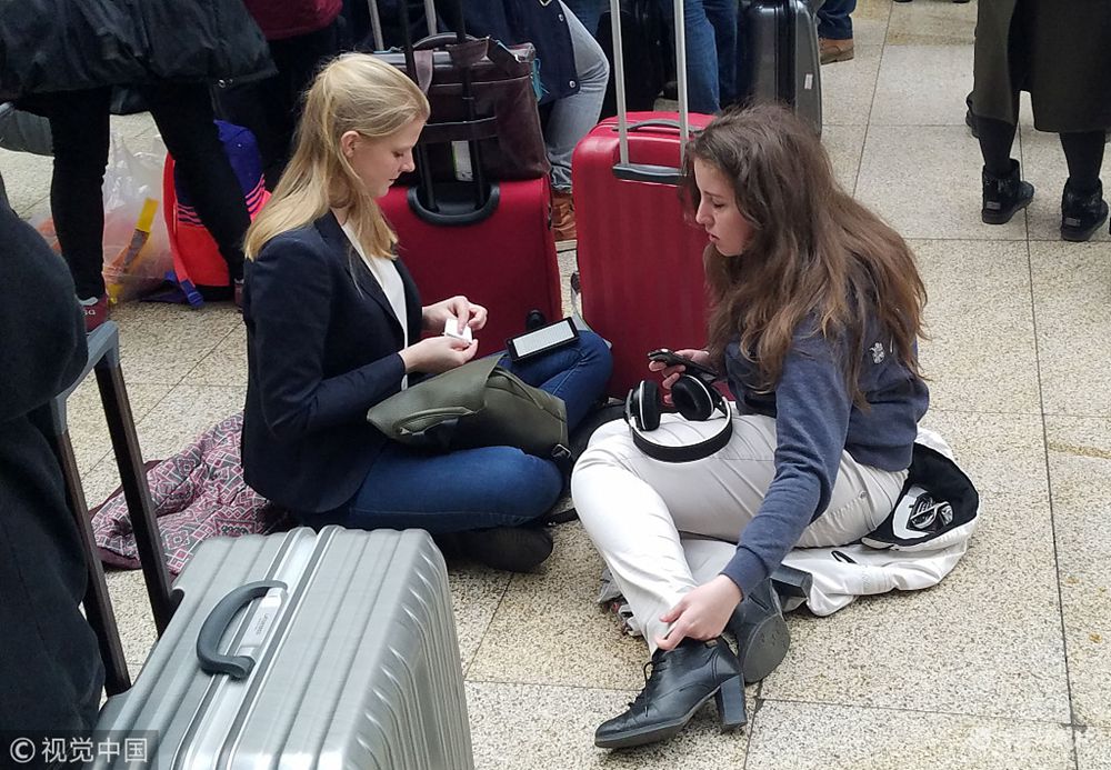 2018年1月19日下午,北京,兩名從來(lái)沒(méi)有感受過(guò)“春運(yùn)”氣氛的荷蘭美女,因排隊(duì)時(shí)間太久、無(wú)法忍受雙腿酸痛,干脆鋪上衣服癱坐在地上。